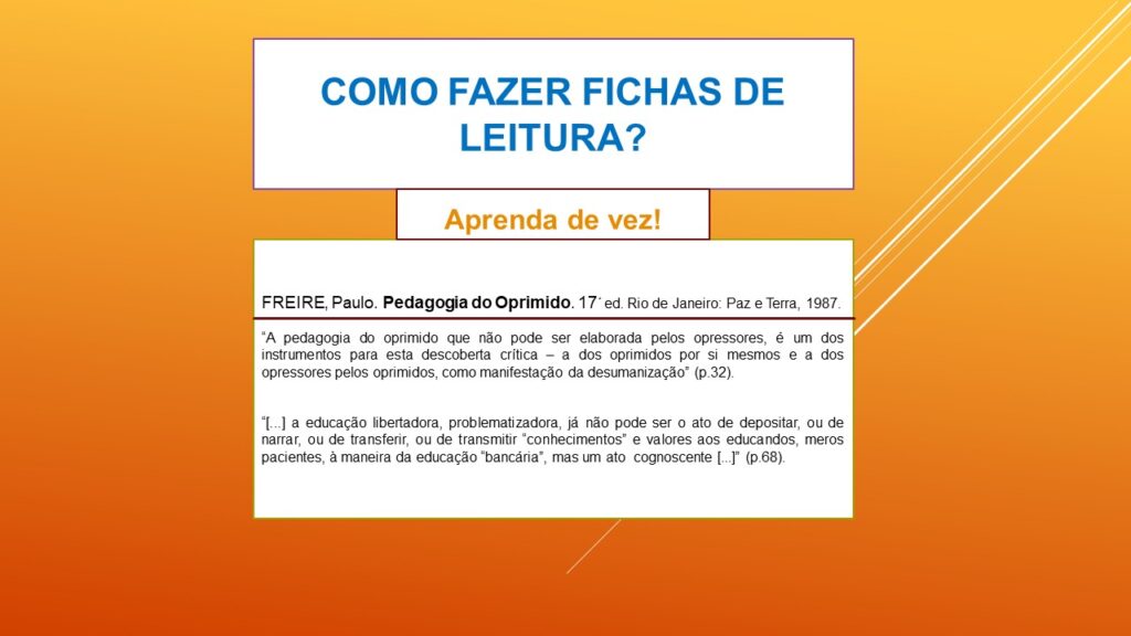 Geralmente só se aprende o que são fichas de leitura na graduação. Infelizmente é uma grande falha, pois pode ser muito útil para orientar os estudantes do Ensino Médio a se prepararem para o Enem, além de ajudar aos concurseiros a reterem tantas informações para a tão sonhada conquista da estabilidade.